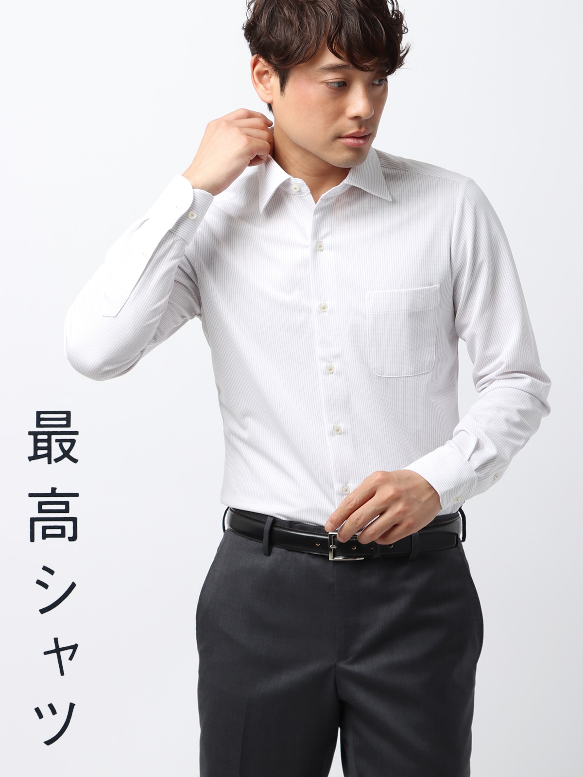 見た目はきちんとしたワイシャツでありながら、Tシャツのような伸縮性&なめらかな肌触りのジャージーシャツ。さらに、ウォッシャブル、ノンアイロン、防シワ、速乾など、ビジネスマンに欲しい機能も保持。