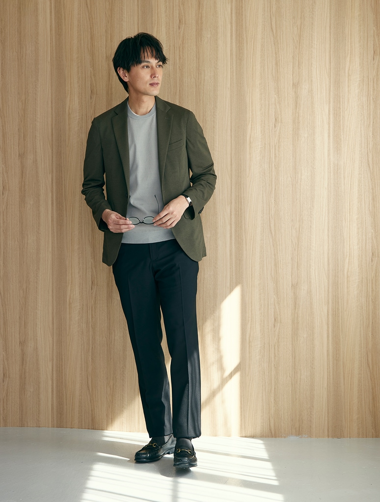 セットアップスタイル以外にも、ジャケット・パンツの単品使いも◎1着持っておくと、色々な着回しを楽しめます。