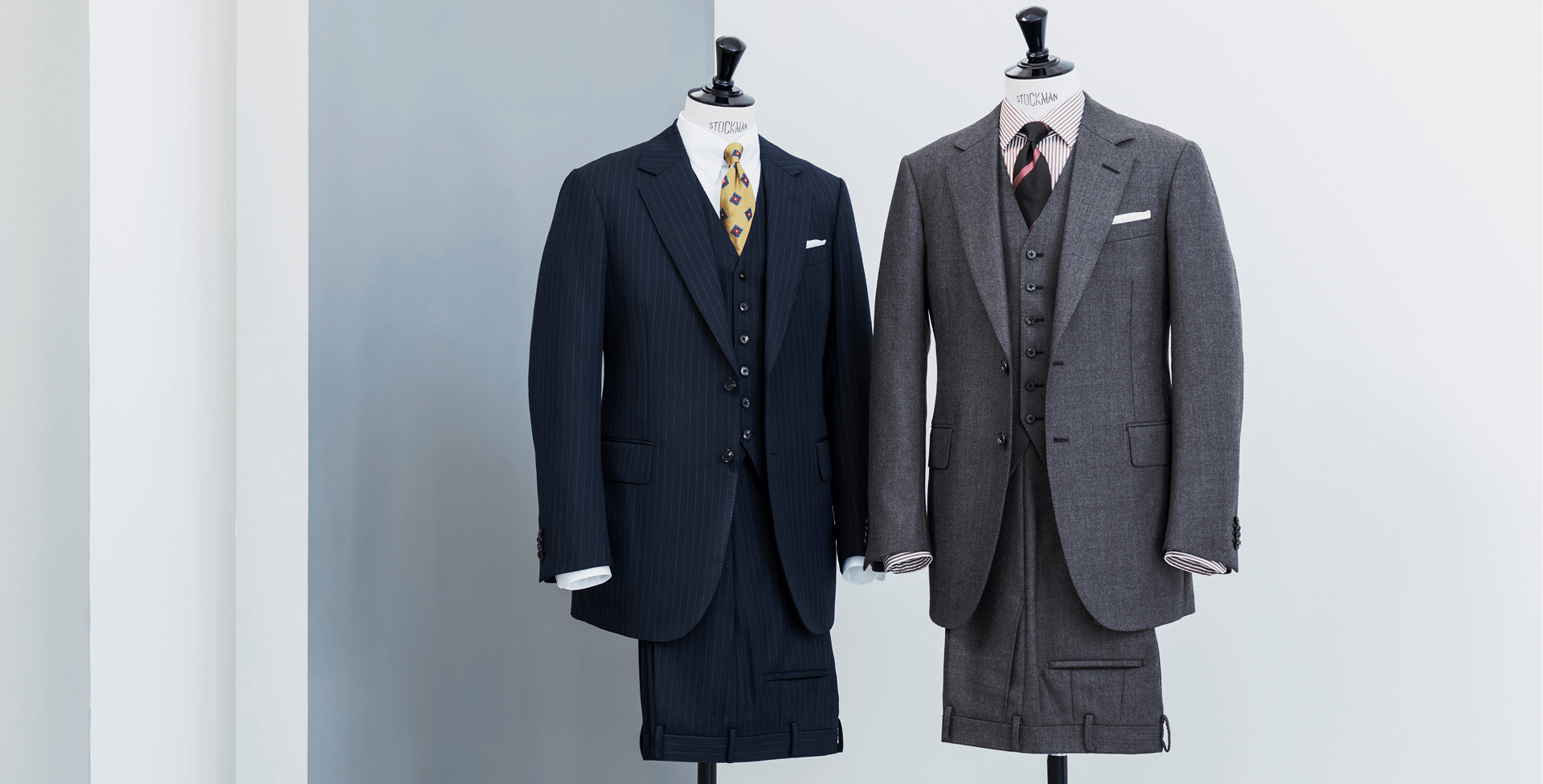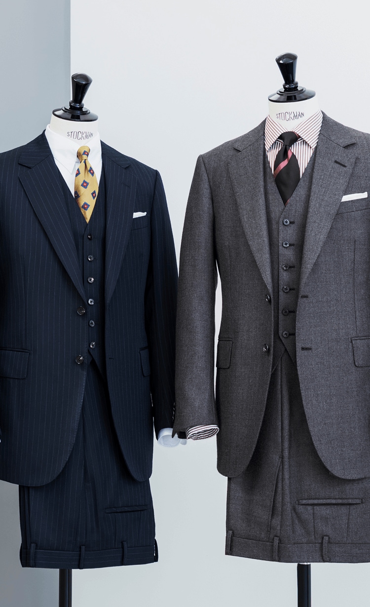 「イタリアのスーツスタイルにおいて最も重要視されるのは“軽快感”。これは着心地だけでなく、見た目の雰囲気にもいえることです。たとえば、肩周りをシャツのようにふんわりと仕立てたり、裾のラインを流れるようにカーブさせたり。いっぽうブリティッシュスタイルは、威厳や格調、気品といったイメージを体現しています。肩、ウエストシェイプ、裾のラインなど、どこをとってもイタリアとは異なる特徴があります。生地についても、適度にウェイトがあり、パリっと仕立て映えするものが好まれます。