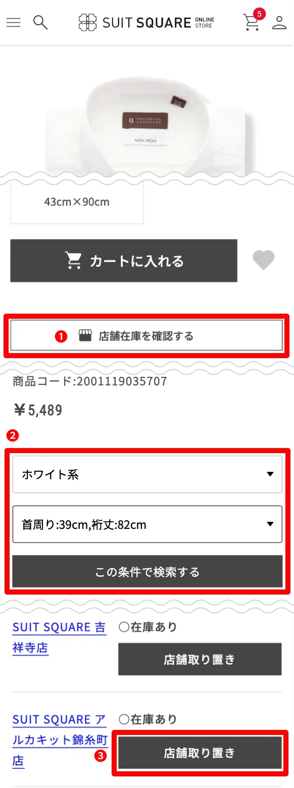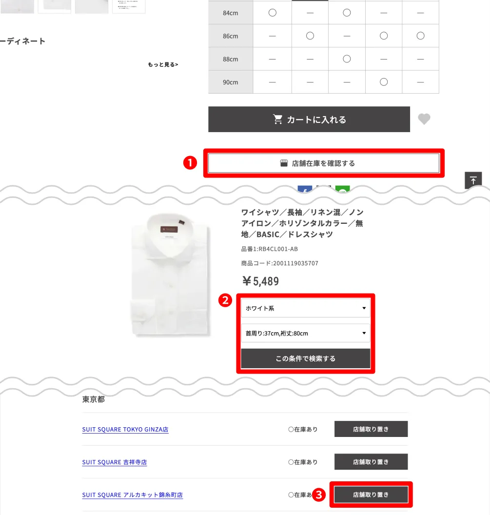 ①気になる商品の詳細ページから「店舗在庫を確認する」ボタンをタップ。