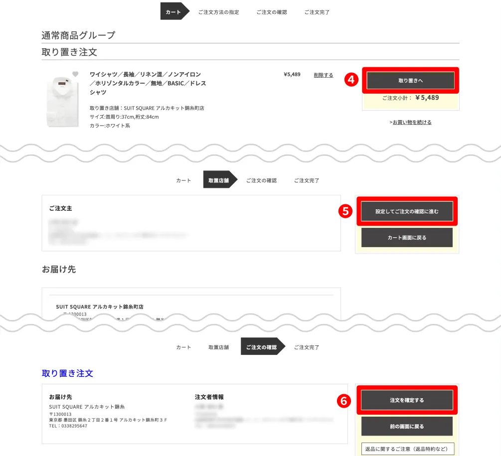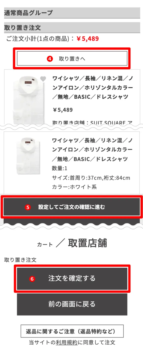 ⑤取置店舗 画面の「設定してご注文の確認に進む」ボタンをタップ。