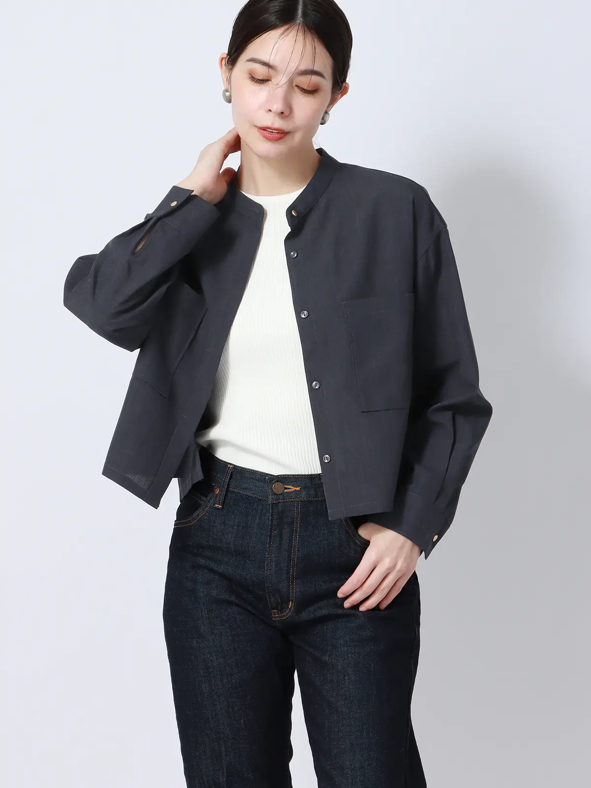 見た目も着心地も涼し気な、麻調素材を使用したバンドカラーシャツ。トレンド感ある短丈ブラウスは、前開きにしてジャケットのように羽織っても◎ 大き目の胸ポケットを左右に配し、1枚で主役になるアイテムです。
