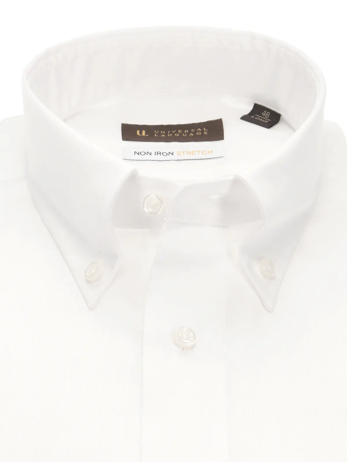 シンプルなホワイトの織柄シャツはどんなスーツにも合わせやすく、汎用性抜群! 襟先をボタンで留めたボタンダウンカラーなら、ノーネクタイでも立体感のある襟元が実現。