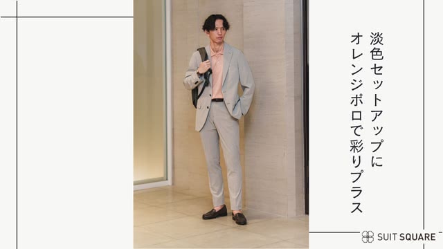 ライトグレーのグレンチェックセットアップに柔らかなオレンジのポロシャツで、彩りをプラスしたスタイルです。トラッドなダークブラウンのローファーを合わせることで、明るい色合わせでも締まりが出ます。