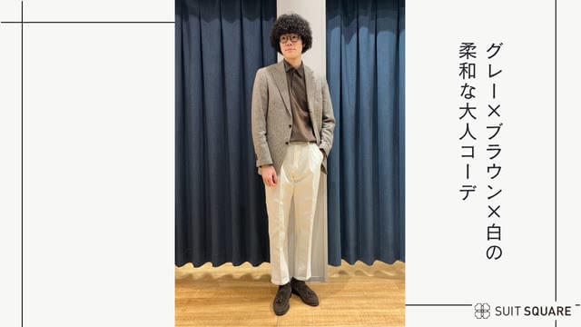 グレージャケットにブラウンのニットポロを合わせた、柔らかのある上品スタイルです。白パンツが軽さを出してくれるため、ブラウン系トップスでも重く見えず、足元も同系色でまとめるとより統一感のある着こなしになります。