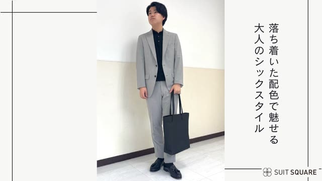 ▶ライトグレーのセットアップ×黒のポロシャツ