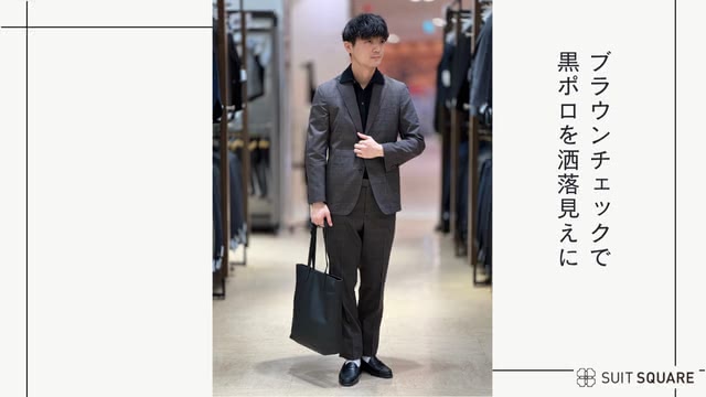 ブラウンのチェック柄セットアップに黒のポロシャツを合わせた、洒落感のあるきれいめコーデです。襟を外に出すことでほどよく抜け感が生まれ、かっちりしすぎずカジュアルさをプラスできます。