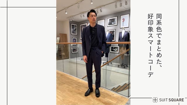 ネイビーのセットアップに黒ポロを合わせた、落ち着きのあるスマートなコーデです。程よい緊張感がありつつ、日常使いもしやすいバランスの取れた着こなしです。
