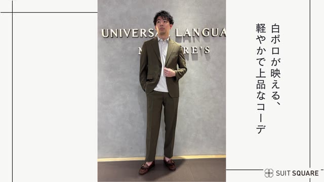 リネンライクな素材感のカーキのセットアップに白いポロシャツを合わせた、軽さを感じるスタイルです。ブラウンのローファーを合わせることで、上品さがプラスされます。