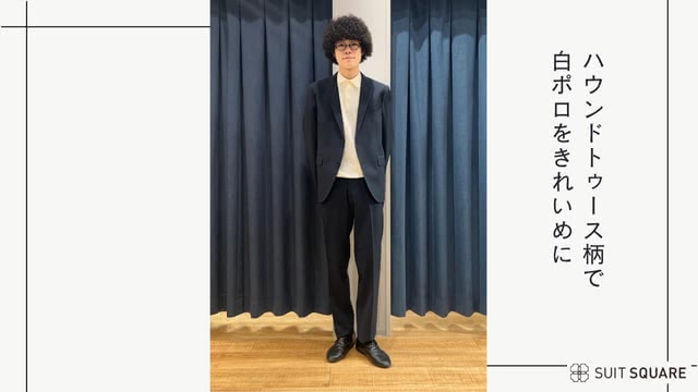 ネイビーのジャケットに白のニットポロを合わせた、きれいめビジネスカジュアルスタイルです。ハウンドトゥース柄のジャケットにニットポロを合わせることで堅くなりすぎず、上品さときちんと感の両方をバランスよく演出できます。