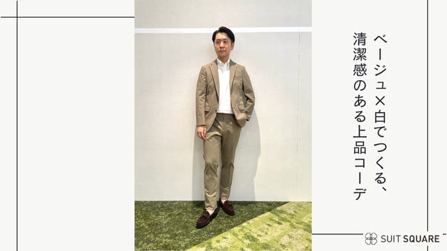 ベージュのセットアップに白のポロシャツを合わせた、清潔感と上品さを兼ね備えたコーデ。シューズをブラウンスエードにすることで全体の色が自然につながり、まとまりのある優しい雰囲気で着こなせます。