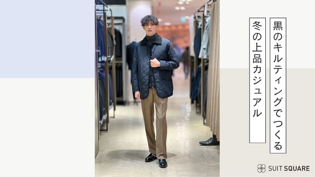 ブラックのキルティングジャケットにタートルネックとベージュのパンツを合わせた、冬らしい上品なビジカジコーデです。インナーをシャツに替えたり、足元をスニーカーにして軽やかなスタイルにもアレンジできます。