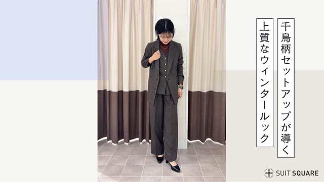 ブラウンの千鳥柄セットアップとハイネックリブニットを重ねた、落ち着きのある冬のきれいめスタイルです。ハイネックリブニットをボルドーから黒に変えるなど、色合わせで雰囲気を簡単にアレンジできるのもおすすめです。