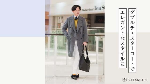 グレーのダブルチェスターコートを主役に、イエローのニットで華やかさをプラスした冬のエレガントスタイルです。タイドアップでクラシックにまとめつつ、白パンツで抜け感を出すことでオンオフどちらにも馴染む大人の着こなしに仕上がります。