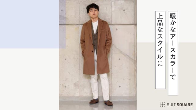 ◆キャメルのチェスターコート×ブラウンのジ×白いパンツ