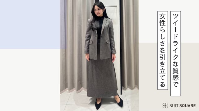 グレーのスカートセットアップと黒のハイネックリブニットを合わせた、落ち着きのある上品なスタイルです。ツイードライクな質感が女性らしさを引き立てるので、袖を軽く折って抜け感を出したり、細めのアクセサリーを合わせて華やぎをプラスするのもおすすめです。
