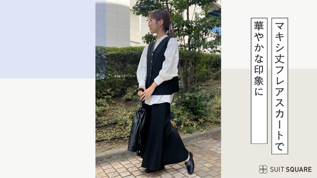 華やかなマキシ丈フレアスカートセットアップにボリュームスリーブの長袖ブラウスとジレを重ねた、上品な抜け感スタイル。ジレをジャケットに替えるなど気分でアレンジも楽しめます。