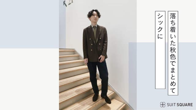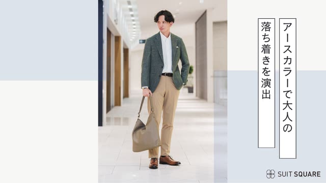 グリーンのウールリネンジャケットに白のワイシャツを合わせ、季節感のある深みと軽やかさを両立した秋のアースカラーコーデです。ベージュのパンツとブラウンシューズを取り入れることで、秋らしい柔らかさと落ち着きのあるスタイルに仕上がります。