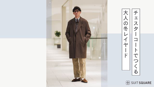 ブラウンのチェスターコートにチェックワイシャツを合わせた、大人の冬レイヤードスタイル。赤みのあるヘリンボーン柄が季節感を添え、ベストやベージュパンツを重ねることで上品さと暖かさがプラスされます。