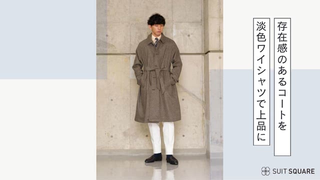 クラシックなガンクラブチェックのコートに淡色ワイシャツを合わせた、上品な冬のスタイル。存在感のあるコートだからこそ、シャツとパンツを白や淡いトーンでまとめ、ネクタイに濃色を合わせることで全体がすっきり整います。