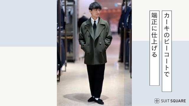 カーキのピーコートに白ワイシャツと黒ニットタイを合わせた、きちんと感のある端正コーデ。コートの幅広ラペルのデザインがアクセントになり、シンプルなシャツスタイルに程よいおしゃれ感が加わります。