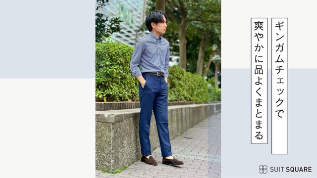 ギンガムチェックのワイシャツにネイビースラックスを合わせた、爽やかで品よくまとまる春のスタイル。足元にブラウンのローファーを合わせることで自然な抜け感が生まれ、堅くなりすぎず好印象に仕上がります。