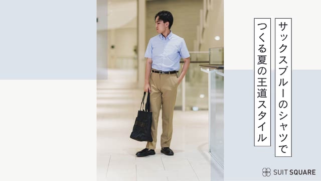 爽やかなサックスブルーの隠しボタンダウンシャツに、ベージュのテーパードパンツを合わせた夏の王道オフィスカジュアルコーデ。冷房対策にグレーやネイビーの薄手カーディガンを合わせるのもおすすめ。