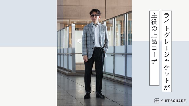 ②ライトグレーのチェックジャケット×白のリネンワイシャツ