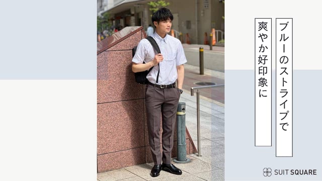 ブルーのストライプが入った半袖シャツにブラウン系スラックスを合わせた、落ち着きのあるコーデ。さりげないストライプで爽やかさと上品さがあり、革靴はもちろん白スニーカーを合わせても軽やかに決まります。