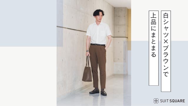 ①白の半袖ワイシャツ×ブラウンのワンタックパンツ