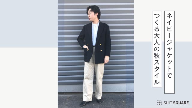 ネイビージャケットと白ワイシャツ・ベージュのワイドパンツを合わせた抜け感のあるスタイルです。ジャケットのリラックス感を活かすためにも、シャツはタックインして全体の重心を整えるとバランス良くまとまります。