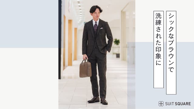 深みのあるブラウンのスリーピーススーツに白ワイシャツとボルドーのネクタイを合わせた、洗練された印象のビジネススタイル。小柄のチェックがさりげない上品さを添え、バッグとシューズを同系色でまとめるのがポイントです。