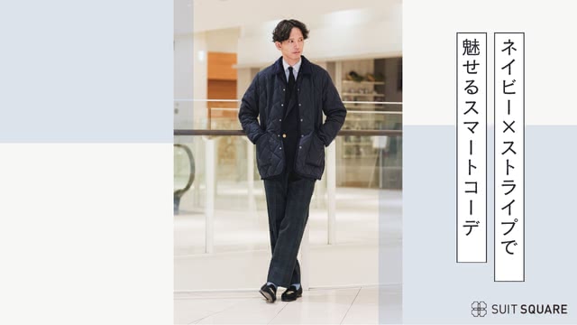 ②ネイビーのキルティングアウター×ブルーストライプのワイシャツ