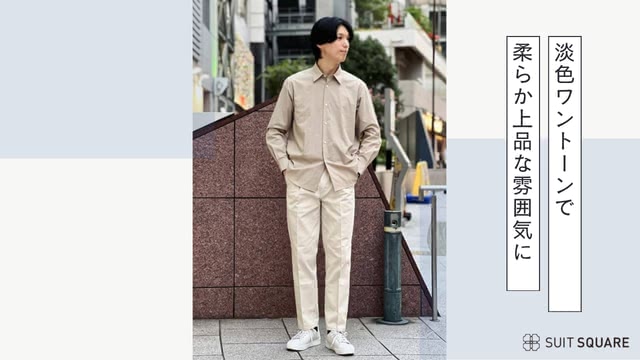 ベージュのワイシャツに淡いトーンのパンツを合わせた、柔らかく上品な春のオフィスカジュアル。よりきちんと見せたい日は、白スニーカーを革靴に替えるだけでビジネス感がぐっと高まります。