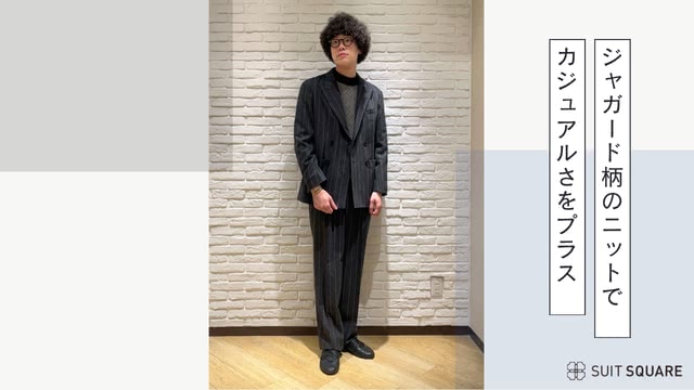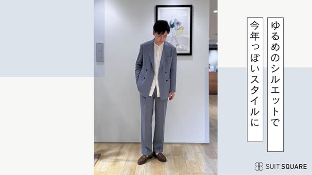 おすすめのダブルブレストセットアップ。ほどよいドレープ感が魅力で、ビジネスカジュアルのあらゆるシーンで活躍します。ドレススウェットの上にジャケットを羽織るだけでもサマになり、簡単にきちんと見えが叶います。