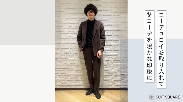 おすすめのダブルブレストジャケットセットアップ。コーデュロイ素材で季節感たっぷりに仕上がり、寒い時期のコーデにぴったりです。長時間着てもシワになりにくく、お手入れがしやすい点も◎。