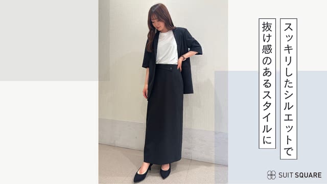 おすすめのブラックの半袖ジャケットとIラインのロングスカートセットアップ。を合わせたスタイル。インナーをTシャツでラフに寄せても、ブラウスに変えても決まりやすく、トップス次第で雰囲気を変えられます。