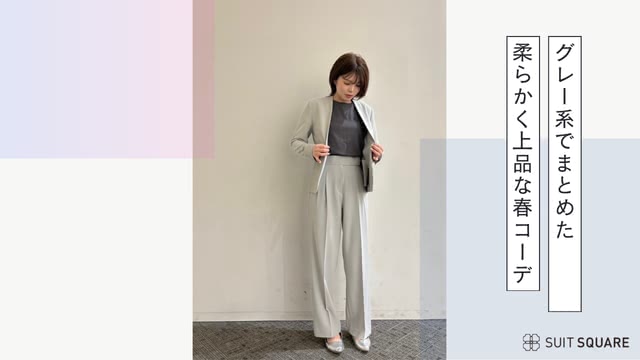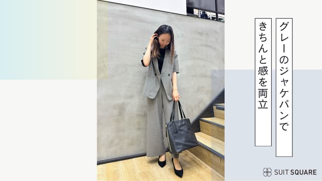 おすすめの半袖ジャケットとワイドパンツのセットアップ。明るすぎないグレーで落ち着いた印象に。さらっとした素材で暑い時期もさらりと着られます。