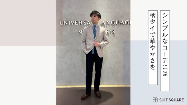 おすすめのベージュのテーラードジャケット。柔らかなトーンで、羽織るとコーデに上品な印象をプラスできるアイテムです。パンツやネクタイに柄を取り入れ、遊び心をプラスするのが◎