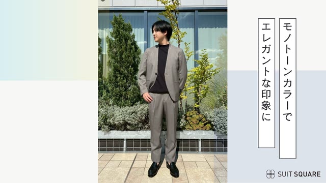 おすすめのテックウール素材のセットアップ。ノーカラージャケットは程よくフィットし、スタイリッシュなシルエットが特徴です。ウールの高級感を残しながらもストレッチ性があり、動き回りやすく快適に着用できます。
