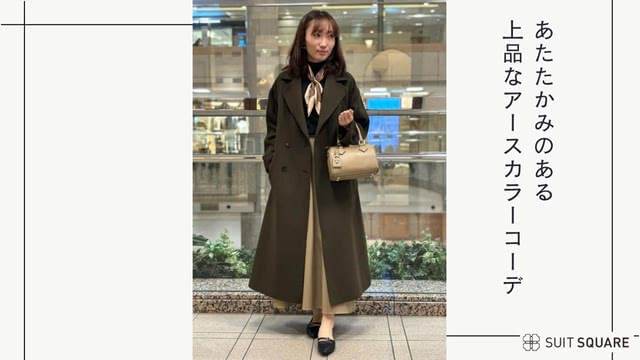 カーキのロングコートとベージュのスカートで、あたたかみのある上品なアースカラーコーデです。淡いトーンがぼやけないようインナーや足元をブラックで引き締めると全体がすっきりまとまり、同系色のスカーフを添えることでさらに品よく仕上がります。