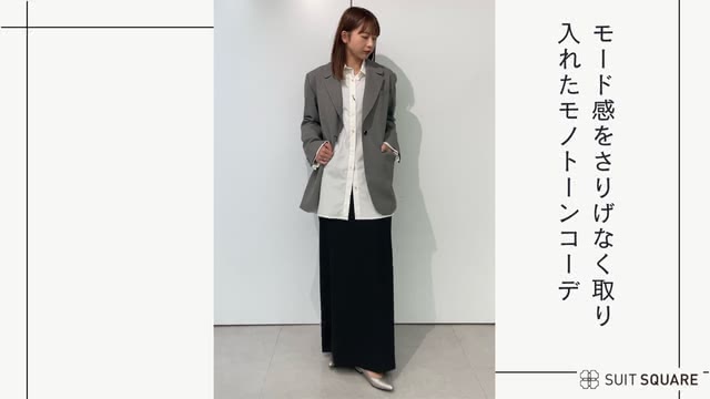 グレーのジャケットとオーバーシャツのレイヤードで、モード感をさりげなく取り入れた大人のモノトーンコーデです。シャツはアウトで縦ラインを出すと今っぽく、インにする場合は前だけ軽くタックを入れるとすっきりとした印象でバランス良く着こなせます。