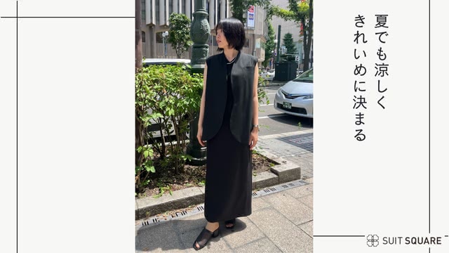 ブラックのワンピースにストライプジレを重ねた、夏でも涼しくきれいめに決まるシンプルモードなスタイリングです。足元をサンダルやヒールに変えてシーンに合わせて雰囲気を調整するのがおすすめです。