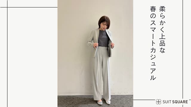 清涼感のあるライトグレーのノーカラージャケットとワイドパンツにチャコールのインナーを合わせた、柔らかく上品な春のスマートカジュアルスタイルです。明るいトーンのセットアップは春らしい軽さが出るので、足元にシルバーなどの明るめシューズを取り入れると季節感のある軽やかな印象になります。