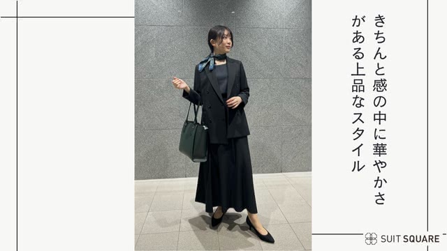 オールブラックのセットアップにスカーフを添えて、きちんと感の中に華やかさがある上品なスタイルです。首元にポイントを持ってきて、バッグやシューズはシンプルにまとめるとより洗練された印象になります。