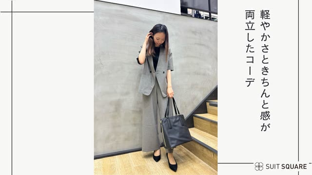 半袖ジャケット×ワイドパンツのセットアップが、軽やかさときちんと感を両立させたコーデです。落ち着いたグレーは黒トップスとも相性抜群で、仕事だけでなく休日にも使いやすく小物次第で雰囲気を変えられます。
