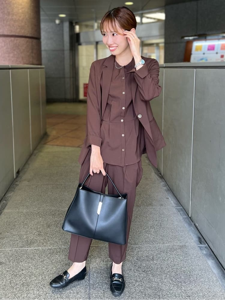 ブラウンでまとめた落ち着きのあるコーデ。ペプラムブラウスとビットローファーを合わせてほどよい華やかさをプラス。ゆとりのあるシルエットが抜け感をつくり、ノンヒールでもバランスよく決まります。
