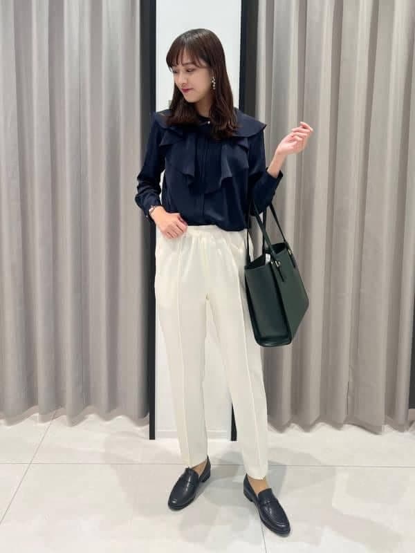 ビッグフリルが印象的なブラウスの上品コーデです。白のテーパードパンツでメリハリをプラス。ブラウスをインすることで、ローファーでもスタイルよくまとまります。