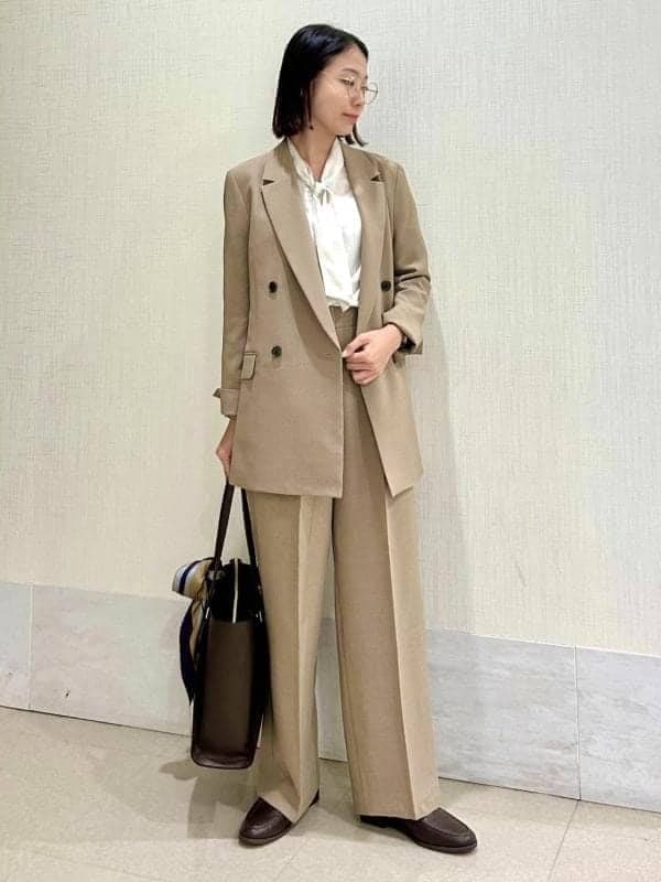 ゆとりのあるセットアップでまとめたベージュカラーコーデ。柔らかい素材のタイブラウスを合わせて優しい雰囲気をプラス。ブラウンのローファーを合わせると、より落ち着きのある大人の女性にぴったりな着こなしになります。